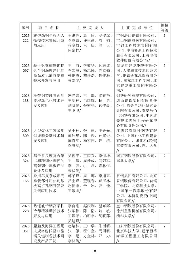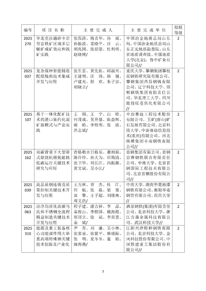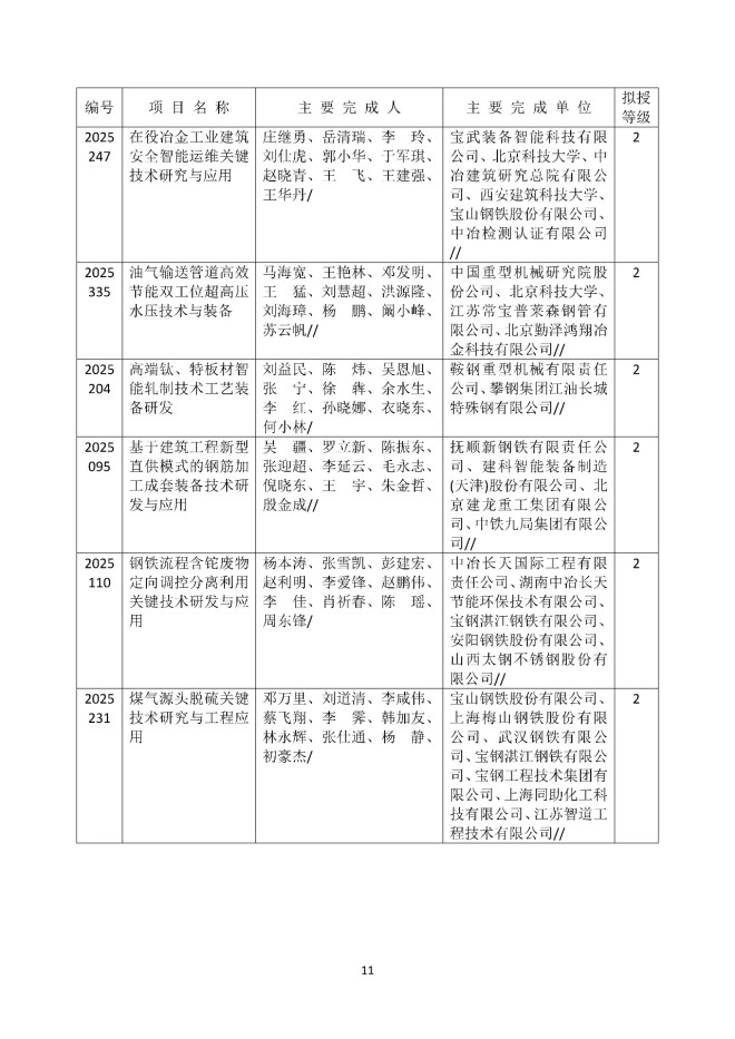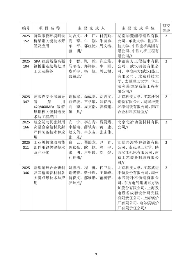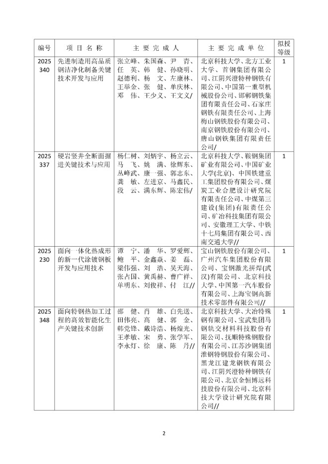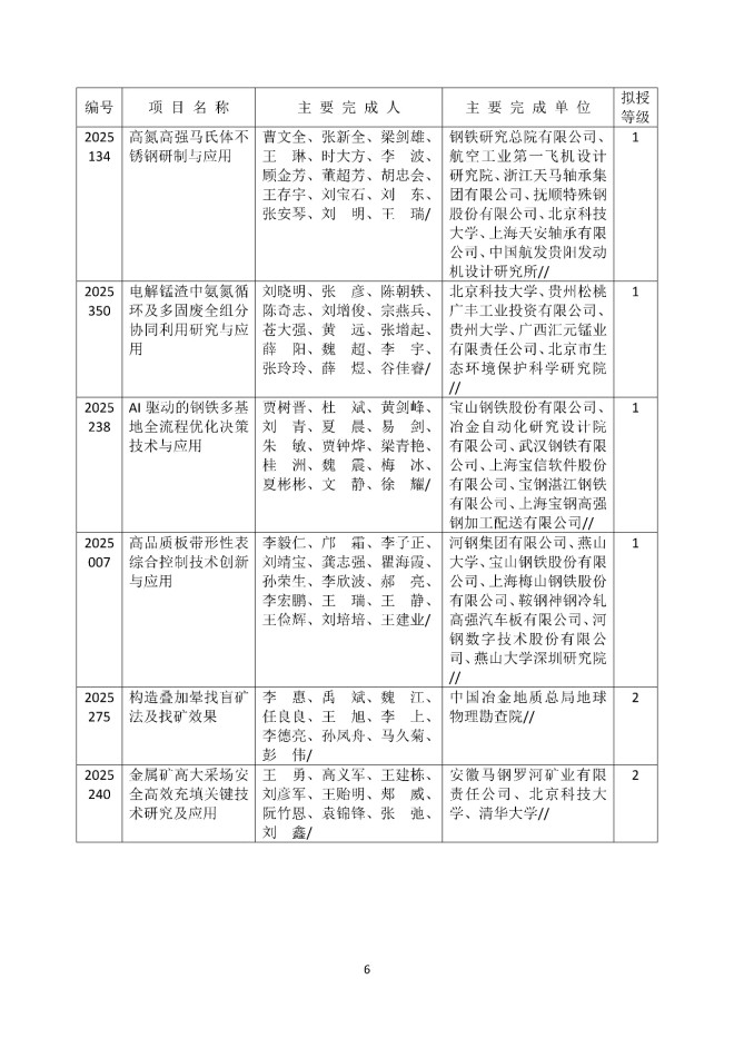 2025年冶金科學技術獎評審委員會推薦獲獎項目公告