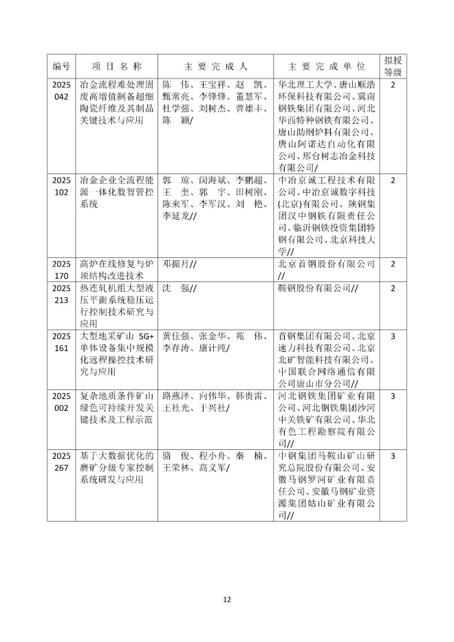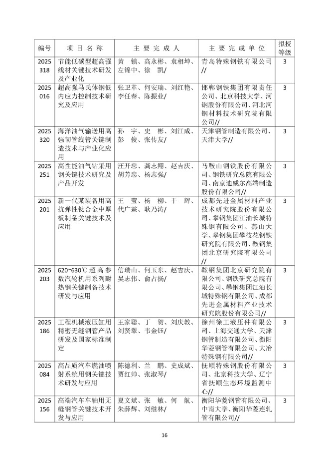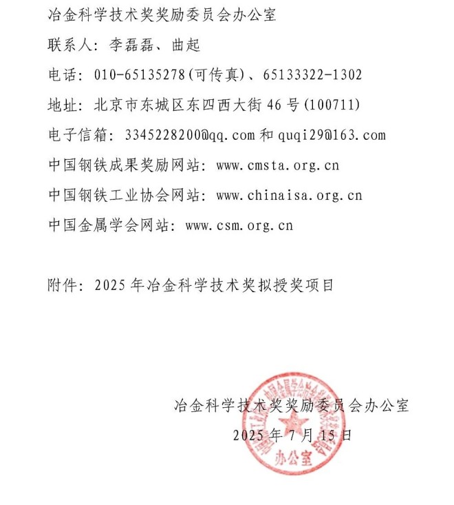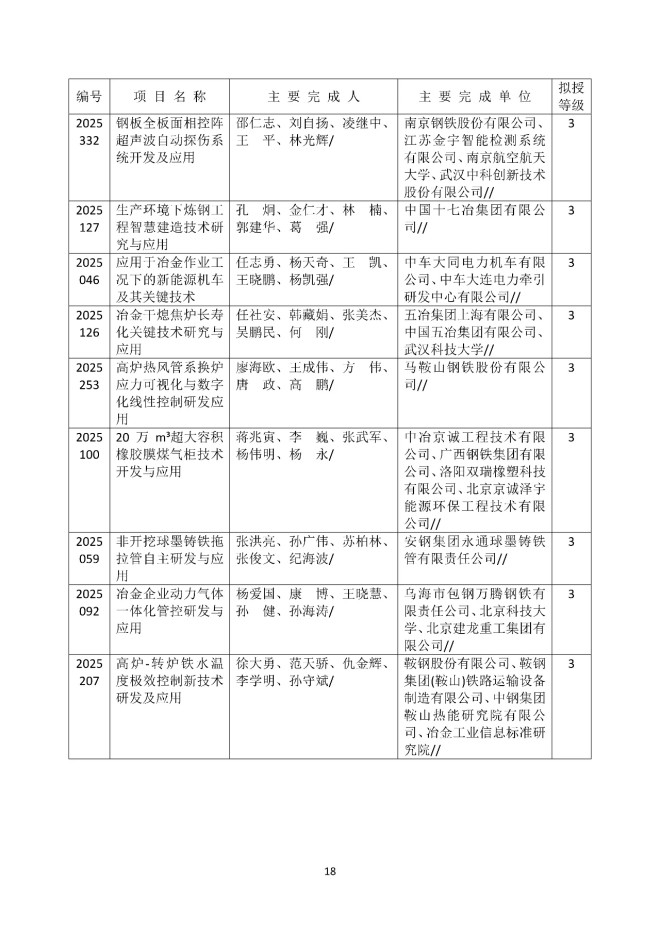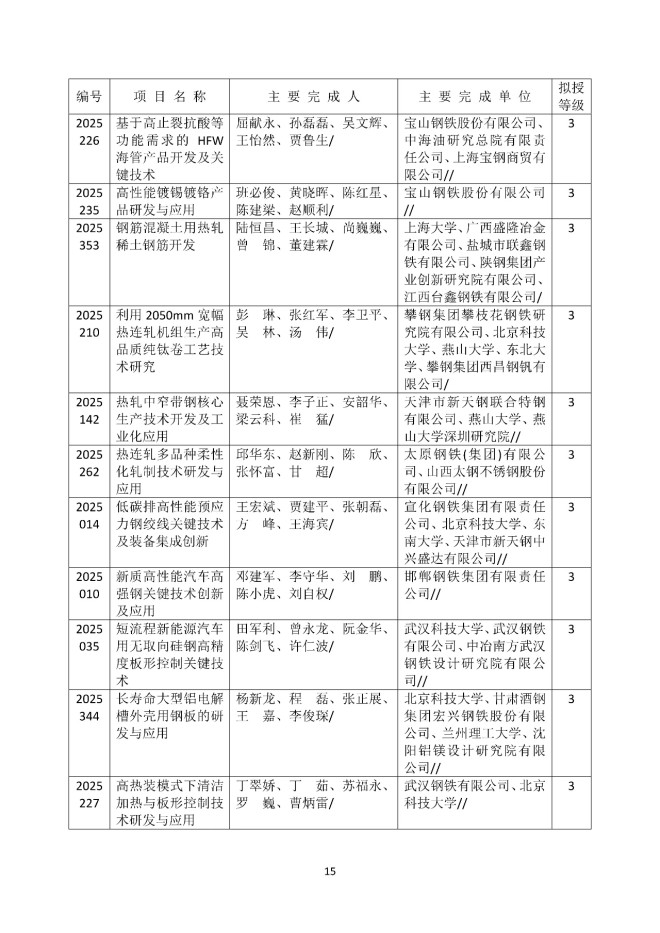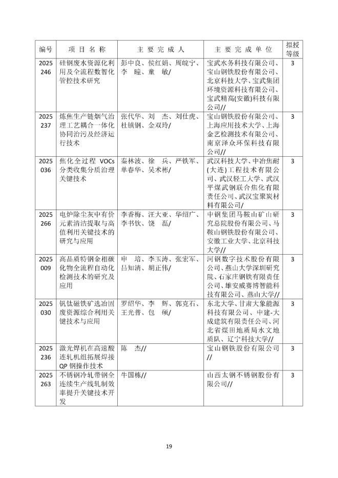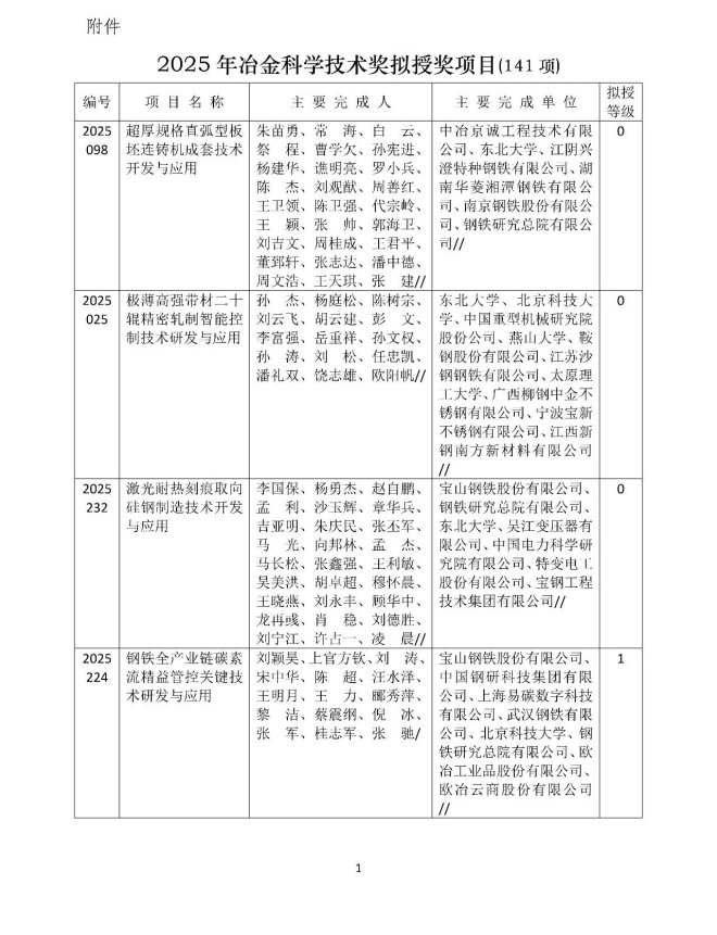 2025年冶金科學技術獎評審委員會推薦獲獎項目公告