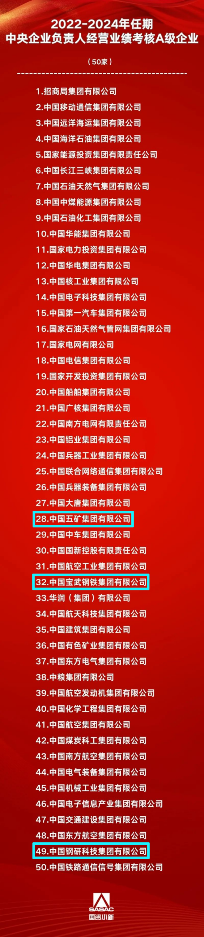 近日,國資小新公布2024年度和2022-2024年任期中央企業(yè)負(fù)責(zé)人經(jīng)營業(yè)績考核A級企業(yè)名單。