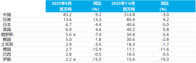 2025年6月全球70個納入世界鋼鐵協會統計國家/地區的粗鋼產量為1.514億噸,同比下降5.8%。