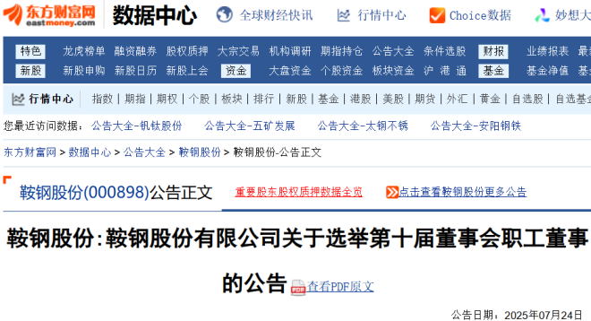 鞍鋼股份有限公司(以下簡(jiǎn)稱“公司“)于 2025 年 7 月 16 日召開(kāi)職工代表大會(huì),選舉趙忠民先生為公司第十屆董事會(huì)職工董事,選舉結(jié)果已公示無(wú)異議。趙忠民先生將與公司 2025 年第二次臨時(shí)股東大會(huì)選舉產(chǎn)生的非職工董事共同組成公司第十屆董事會(huì),任期與第十屆董事會(huì)一致。