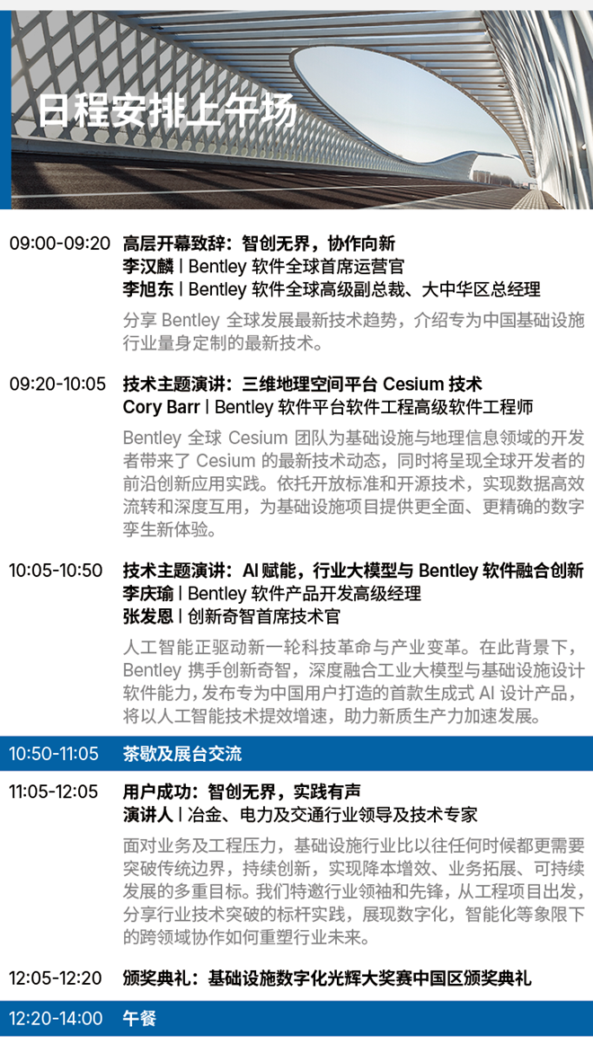 2025 Bentley 基礎設施數字化技術峰會作為專為中國基礎設施領域領軍技術企業和專業人士量身定制的頂級技術盛會,這里匯聚行業先鋒、技術大咖與思想領袖,帶您體驗行業未來智創脈動,解鎖最前沿的技術發展趨勢。無論您是尋求突破的決策者,還是深耕技術的探索者,歡迎您的參與 ! 我們協作向新,共同探索基礎設施技術的新靈感與新方向!