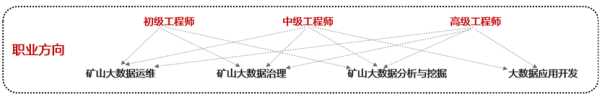 《評價規范》共劃分了4個職業方向,初級對應3個方向,中高級對應4個方向。其中,礦山大數據運維方向的職業功能(技能項)包括大數據平臺管理與運維和大數據運營管理,礦山大數據治理方向的職業功能包括數據治理和大數據運營管理,礦山大數據分析與挖掘方向的職業功能包括大數據分析與挖掘和大數據運營管理,大數據應用開發方向的職業功能包括大數據應用開發和大數據運營管理。