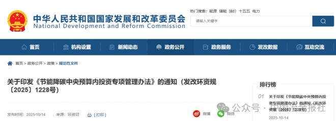 10月14日,國家發展改革委網站發布了關于印發《節能降碳中央預算內投資專項管理辦法》的通知(以下簡稱《通知》)。