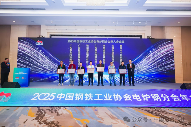 會上舉行了電爐鋼分會新入會企業授牌儀式。駱鐵軍、黃永建為新入會企業授牌。