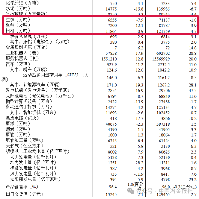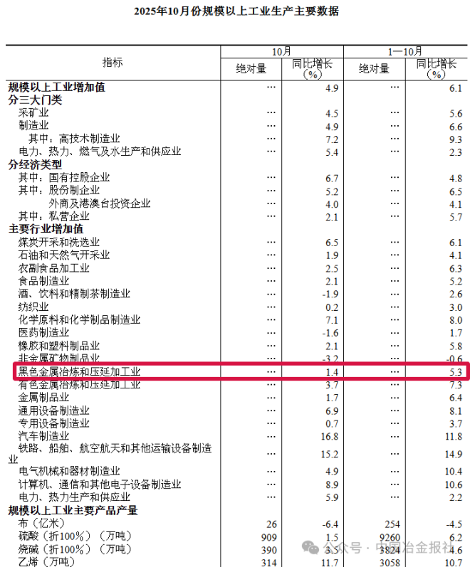 據國家統計局官網近日發布,2025年10月我國粗鋼產量7200萬噸,同比下降12.1%;生鐵產量6555萬噸,同比下降7.9%;鋼材產量11864萬噸,同比下降0.9%。