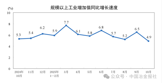 10月份,規模以上工業增加值同比實際增長4.9%(增加值增速均為扣除價格因素的實際增長率)。從環比看,10月份,規模以上工業增加值比上月增長0.17%。1—10月份,規模以上工業增加值同比增長6.1%。