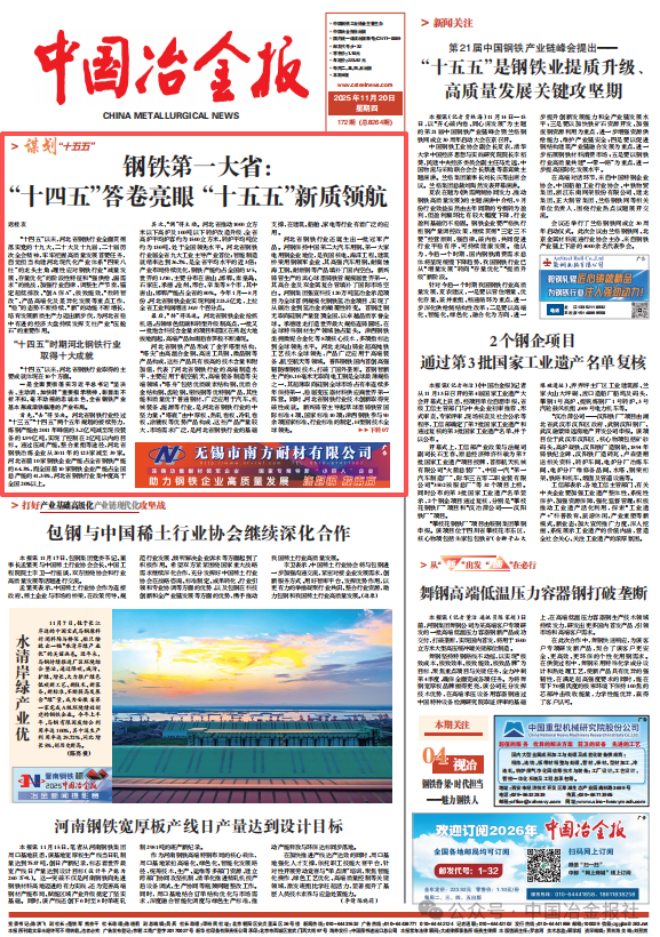站在“十四五”與“十五五”的歷史交匯點上,河北省鋼鐵行業面臨承前啟后、繼往開來、舉旗定向的關鍵時刻,既要系統總結好“十四五”時期的發展經驗,又要前瞻性布局做好“十五五”規劃;既要重視戰術,又要重視戰略;要低頭拉車,也要抬頭看路。河北鋼鐵人一定會以“鋼鐵脊梁”支撐鋼鐵強國建設 ,堅定信心,理性應對,破局而生,和合共贏,為奮力譜寫中國式現代化建設河北篇章繼續做出新貢獻。