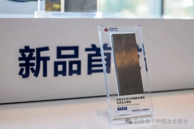 核電安全殼冷卻輔助水箱用異質復合鋼——AG728+022Cr17Ni12Mo2:鞍鋼集團聯合設計單位歷時2年研制,率先應用于3代非能動壓水堆核電機組。與奧氏體不銹鋼相比,抗拉強度大幅提升,綜合成本顯著下降。攻克組坯焊接、超寬板幅等難題,成功生產寬度3700mm超寬規格產品,通過嚴苛焊接與應用評價。