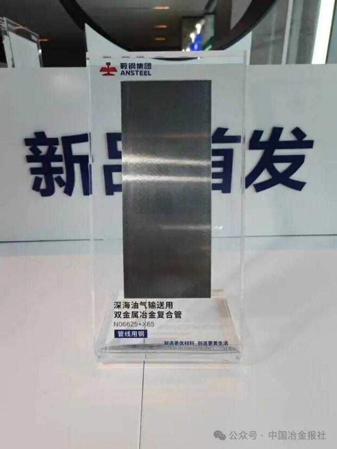 深海油氣輸送用雙金屬冶金復合管用鋼——N06625+X65:由鞍鋼集團牽頭聯合10余家單位研發,依托工信部項目,采用X65管線鋼與N06625鎳基合金軋制復合制成。兼具基層高強韌性與覆層耐腐蝕性,經鋼研納克檢測達標,通過EPD環保認證。采用真空組坯及軋制復合技術,減少厚板開坯工序,經JCO成型制成大口徑復合管,填補國內空白。適配深海高腐蝕環境,為深海油氣資源開發筑牢輸送“生命線”。