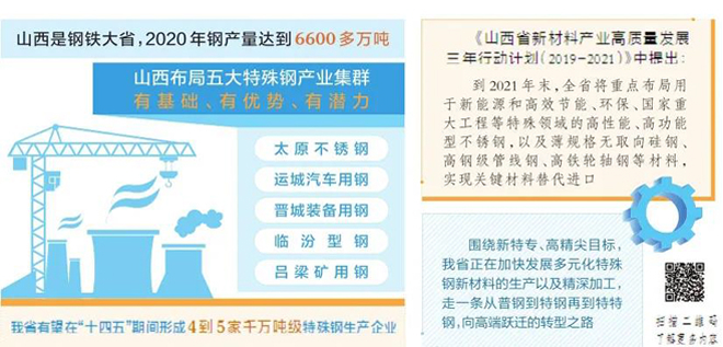 近幾年,圍繞“新特專、高精尖”目標,山西加快發展多元化特殊鋼新材料產業,并提出了從“特鋼”向“特特鋼”邁進的戰略目標,為國家重大工程、重大裝備提供關鍵基礎材料支撐。