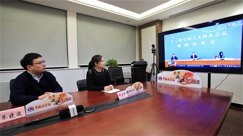 3月4日21時40分,十三屆全國人大四次會議在北京人民大會堂新聞發布廳舉行新聞發布會。中國冶金報社兩會報道組記者通過網絡視頻“云”參會。 (本報兩會報道組記者 顧學超 攝)