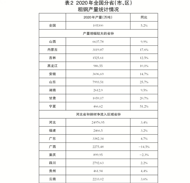 從2020年全國分?。ㄖ陛犑?、自治區)粗鋼產量統計來看,大量存在鋼材凈流出區域的?。ㄖ陛犑?、自治區)粗鋼產量同比大幅增長的現象,反映出國內鋼材市場在生產和消費上的不匹配。而這些省(直轄市、自治區)應該成為控制粗鋼產量的重點限制區域。(見表2)