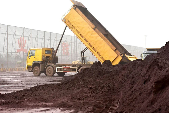 3月28日,在天津港南疆碼頭,卡車在卸載固體廢物,準(zhǔn)備裝船。新華社記者 趙子碩 攝
