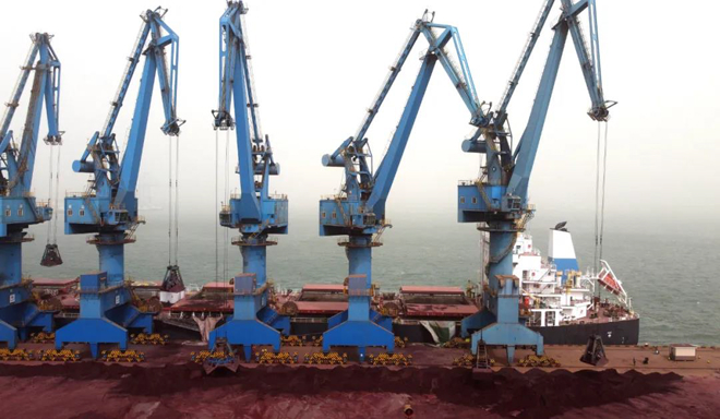 3月28日,天津港南疆碼頭,數(shù)臺(tái)門座式起重機(jī)緊張作業(yè),將紅褐色的粉末裝上貨輪。作為中國海關(guān)系統(tǒng)迄今為止查扣的數(shù)量最大的一批走私入境固體廢物——49.8萬噸硫鐵礦渣的最后一部分即將裝船完畢,這些“洋垃圾”計(jì)劃于夜間駛離天津港,全部退運(yùn)出境。