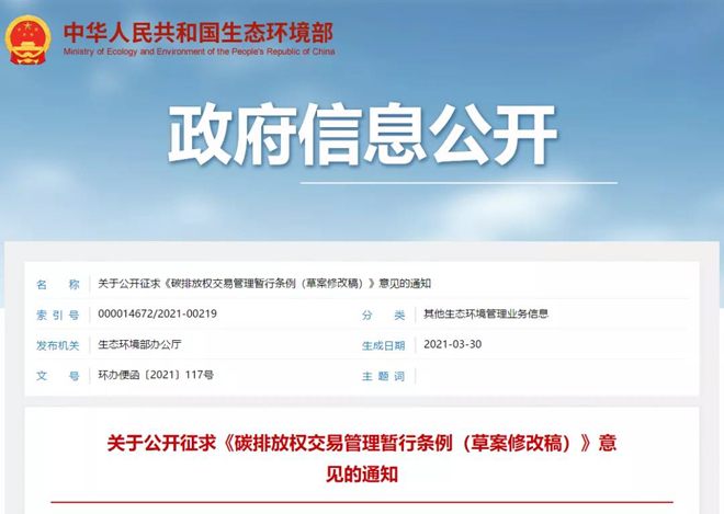 3月30日,生態環境部發布關于公開征求《碳排放權交易管理暫行條例(修改意見稿)》(以下簡稱“《修改意見稿》”)的通知,提出建設全國碳排放權注冊登記和交易系統,記錄碳排放配額的持有、變更、清繳、注銷等信息,提供結算服務,組織開展全國碳排放權集中統一交易。被納入全國碳排放權交易市場的重點排放單位,不再參與地方碳排放權交易試點市場。
