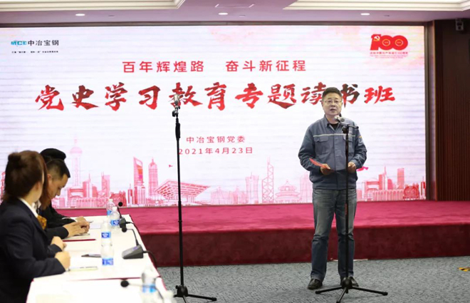 4月23日,中冶寶鋼黨委舉辦“鋼鐵報國?新時代鋼鐵家園”世界讀書日主題活動暨黨史學習讀書班。在舉國同慶中國共產黨成立100周年之際,在全黨上下深入開展黨史學習教育之時,在世界讀書日當天,中冶寶鋼文體聯合會成員和朗誦愛好者以誦讀經典詩詞和職工原創詩歌的方式,重溫新中國鋼鐵冶金建設從無到有、從小到大、從弱到強、從中國走向世界的波瀾壯闊奮斗歷程,演繹新時代鋼鐵家園的恢篇章,在共和國鋼鐵大地上書寫報國之志,以更飽滿的熱情和更高昂的斗志迎接偉大中國共產黨成立100周年。中冶寶鋼專職黨委副書記齊冬平出席活動并即興朗誦組詩《回望百年》。