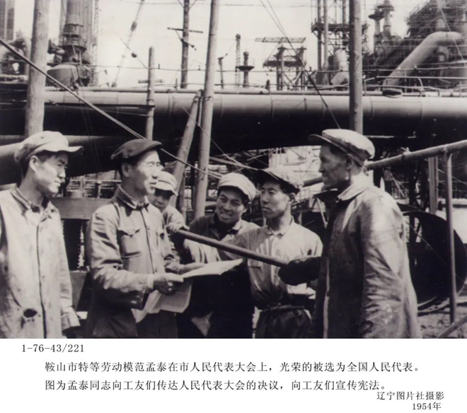 在那段時(shí)間里,老英雄孟泰用他的實(shí)際行動(dòng)成為勤儉節(jié)約、艱苦創(chuàng)業(yè)的楷模,也贏得了工友們的尊敬和愛(ài)戴。1949年7月9日,鞍鋼舉行開工典禮,表彰了141名在護(hù)廠、搶運(yùn)、獻(xiàn)交器材和復(fù)工競(jìng)賽中做出突出貢獻(xiàn)的功臣,其中孟泰等22人被評(píng)為一等功臣。1949年8月1日,歷經(jīng)考驗(yàn)的孟泰光榮地加入了中國(guó)共產(chǎn)黨,成為鞍山解放后發(fā)展的第一批工人黨員。1950年底,孟泰光榮出席全國(guó)工農(nóng)兵勞動(dòng)模范代表大會(huì),成為新中國(guó)的第一代勞動(dòng)模范。1957年,孟泰當(dāng)上了煉鐵廠副廠長(zhǎng),成為從工人中提拔的第一批領(lǐng)導(dǎo)干部。