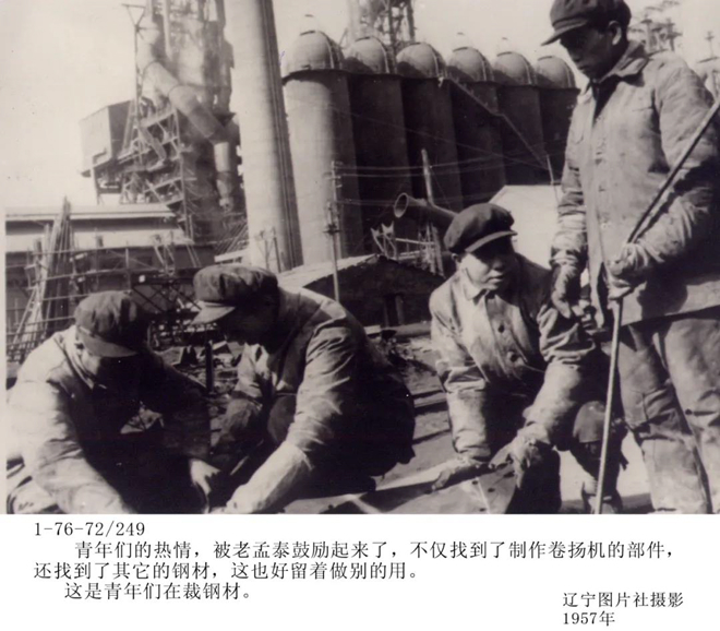 “跟共產(chǎn)黨走,棒打不回頭”——孟泰的一句話,戳中了工友們的心。1948年鞍山解放,歷經(jīng)戰(zhàn)火的鞍鋼回到人民手中時(shí)已是千瘡百孔,日本專家甚至認(rèn)為,斷壁殘?jiān)陌颁搹S區(qū)只能用來(lái)種高粱。為盡快恢復(fù)國(guó)民經(jīng)濟(jì),黨中央要求鞍鋼迅速?gòu)?fù)工。老英雄孟泰發(fā)動(dòng)大家收集、獻(xiàn)交器材,甚至砸破冰層跳進(jìn)齊腰深的水中尋找設(shè)備。在他的帶動(dòng)下,煉鐵廠配管班在短短幾個(gè)月內(nèi)便回收了許多種材料、上萬(wàn)個(gè)零備件。廠里發(fā)動(dòng)工人們獻(xiàn)交器材,數(shù)千職工肩扛、擔(dān)挑、車推,絡(luò)繹不絕,隊(duì)伍從廠區(qū)一直排到幾里開外。