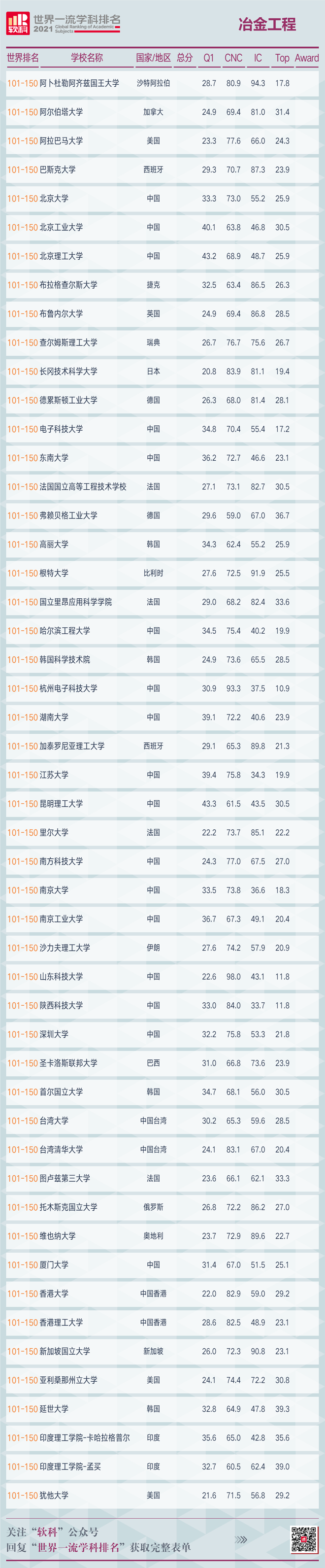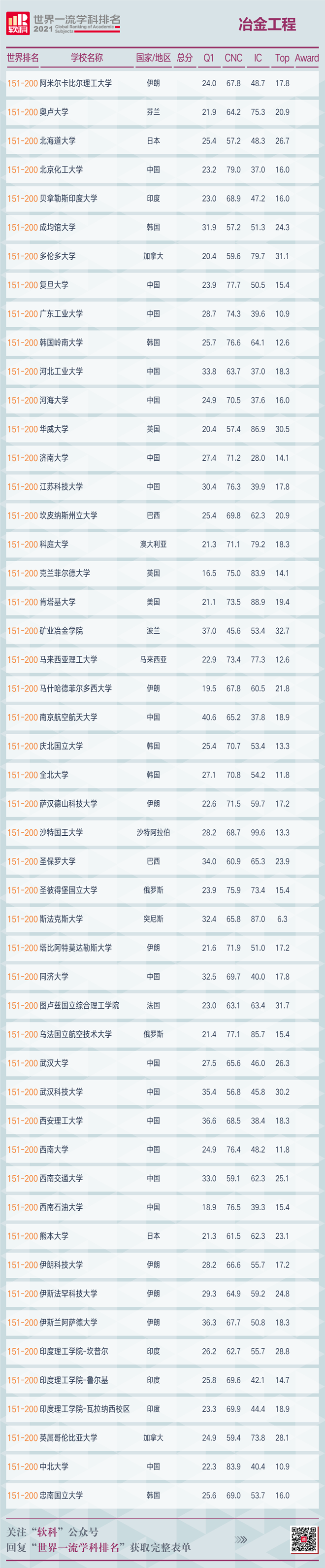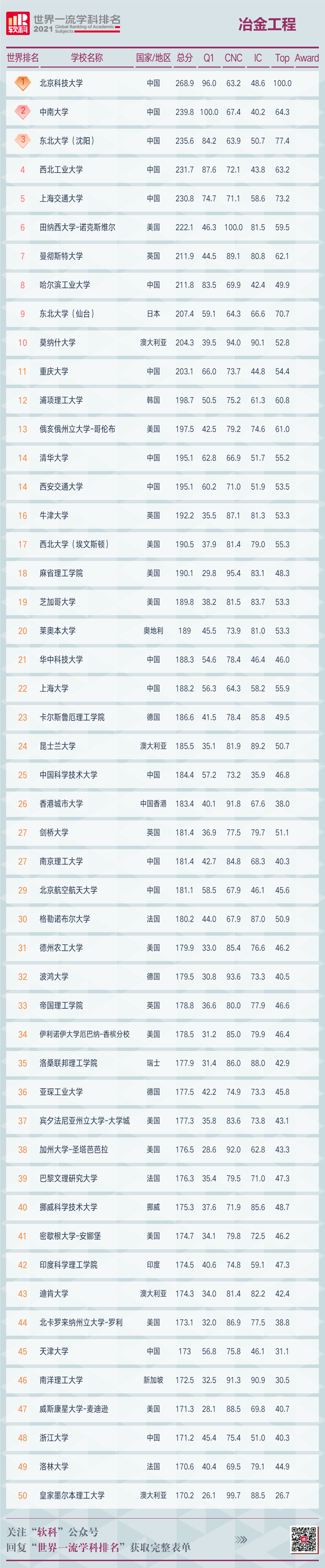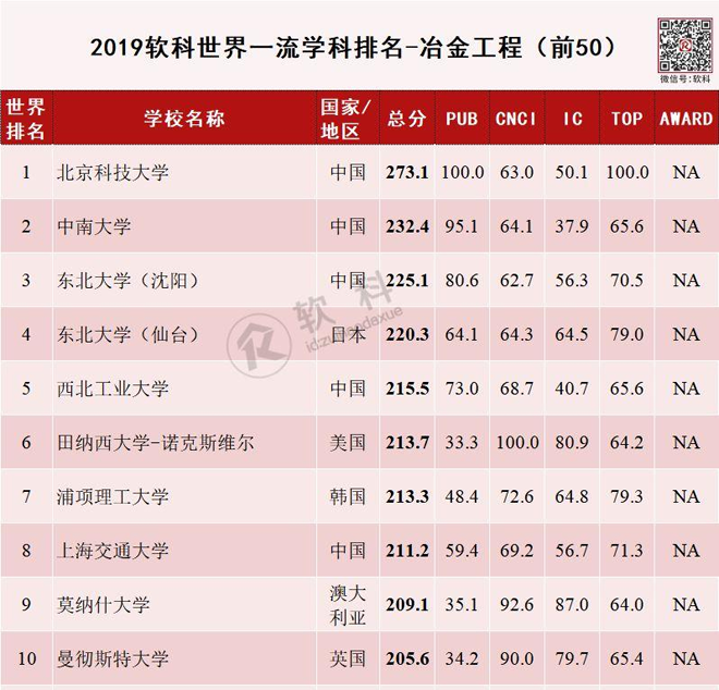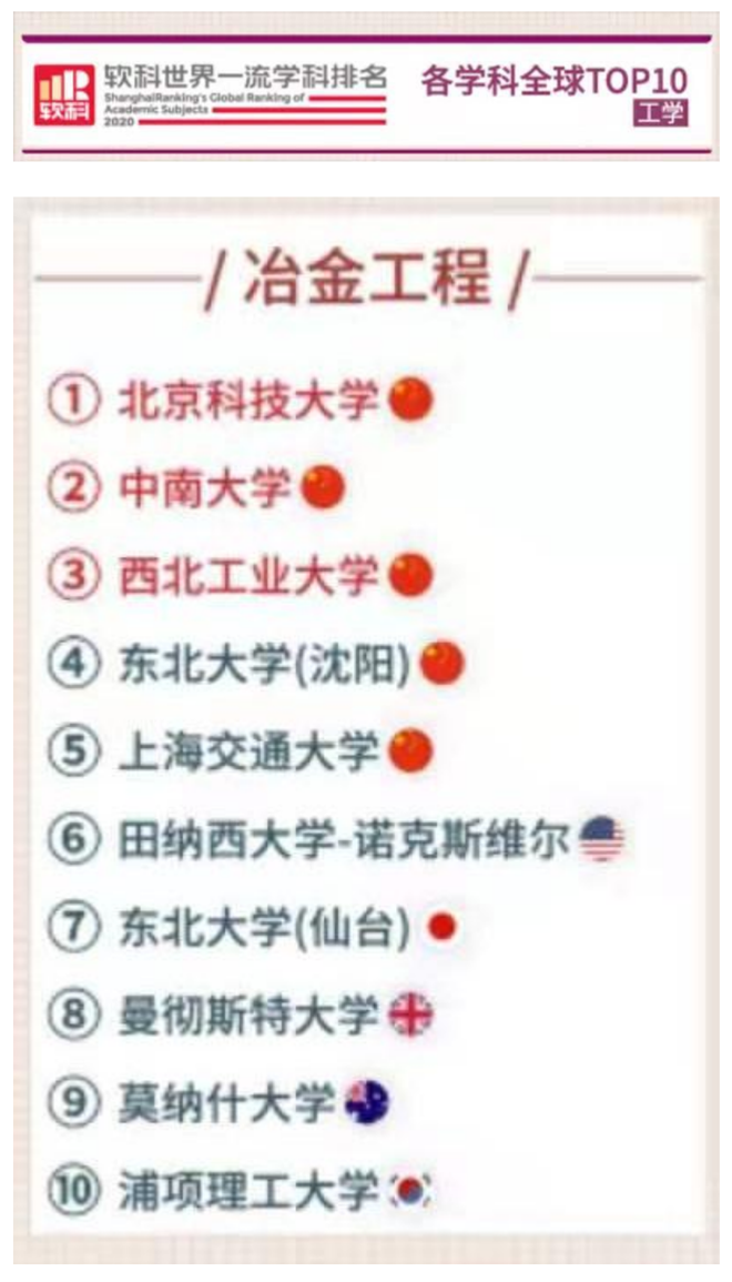 5月26日,高等教育評價專業(yè)機構(gòu)軟科發(fā)布了2021“軟科世界一流學科排名”(ShanghaiRanking's Global Ranking of Academic Subjects)。冶金工程學科共有200所高校上榜,中國繼去年后,又一次包攬全球前五強,排名依次為北京科技大學、中南大學、東北大學(沈陽)、西北工業(yè)大學、上海交通大學。前10名中有6家中國高校上榜,比去年增加1家,哈爾濱工業(yè)大學為新晉十強。