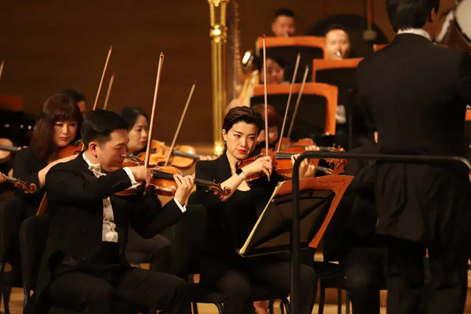 演出由國家一級指揮,天津交響樂團(tuán)團(tuán)長董俊杰擔(dān)任總指揮,邀請?zhí)旖蚪豁憳穲F(tuán)、天津交響樂團(tuán)合唱團(tuán),特邀業(yè)內(nèi)優(yōu)秀男高音、女高音歌唱家共同演繹多曲經(jīng)典音樂作品。演出在交響合唱《沒有共產(chǎn)黨就沒有新中國》中拉開序幕,隨后,《紅旗頌》《愛我中華》《在希望田野上》《唱支山歌給黨聽》等耳熟能詳?shù)慕?jīng)典曲目依次唱響,令觀眾仿佛置身“紅色浪潮”。