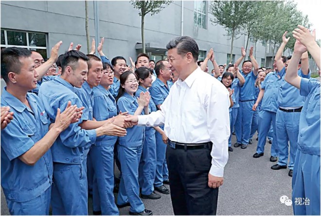 2017年6月22日,中共中央總書記、國家主席、中央軍委主席習近平在山西太原考察企業。圖為習近平在山西鋼科碳材料有限公司同職工親切交流。(新華社記者 龐興雷 攝)