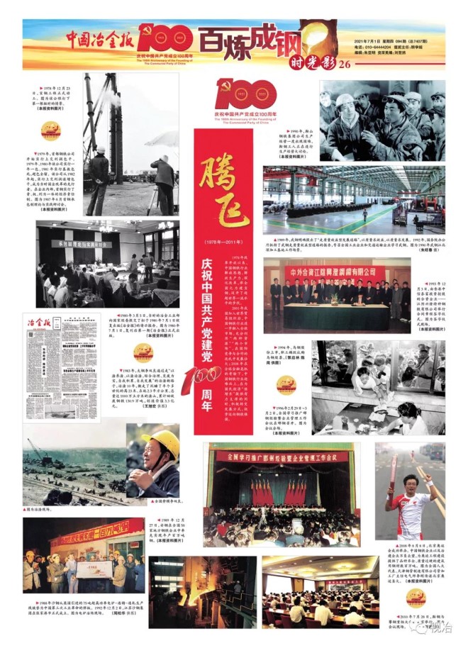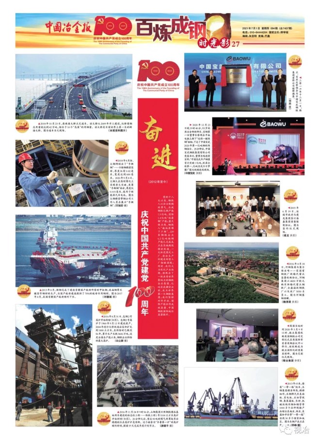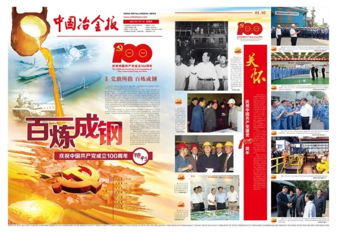 在中國共產黨成立100周年之際,中國冶金報特推出《時光影——建黨百年·百圖鋼鐵》欄目的“七一”特輯,并以《關懷》、《奠基》(1921年—1977年)、《騰飛》(1978年—2011年)、《奮進》(2012年至今)、《擔當》(2012年至今)5個主題篇章呈現,用視覺影像講述中國鋼鐵百年故事,以饗讀者!