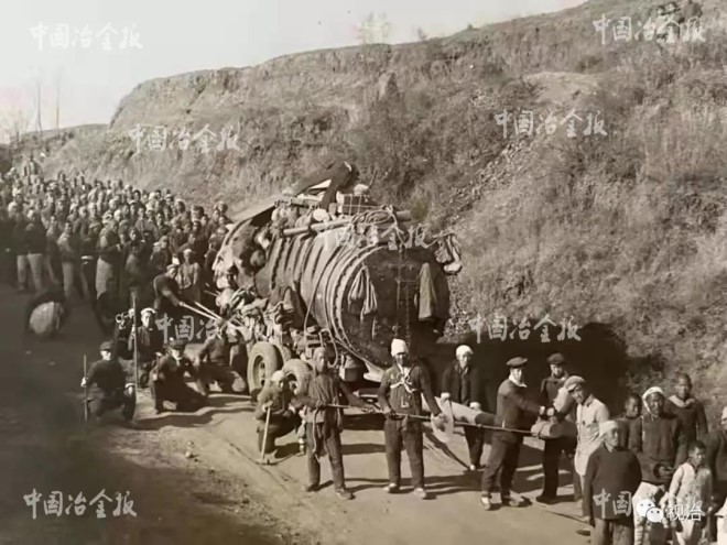 1946年2月,八路軍軍工部經考察后,決定在山西長治故縣村東的溝壑里建設故縣鐵廠(首鋼長鋼公司的前身)。為建設該廠,1947年5月初,晉冀魯豫邊區政府決定將陽泉榮華鐵廠20噸高爐及其附屬設備整體搬遷至故縣。1947年底,20噸高爐正式投產,故縣鐵廠開始大批量生產各種規格型號的迫擊炮彈殼,有力支援了各個解放戰場,這座高爐也被譽為“功勛爐”。圖為1947年搬運高爐設備時的場景。 (首鋼長鋼廠史展覽館 供圖)