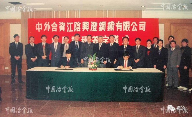1993年12月3日,由香港中信泰富投資控股的合資企業——江陰興澄特種鋼鐵有限公司舉行合同章程簽字儀式。圖為簽字儀式現場。 (本報資料圖片)