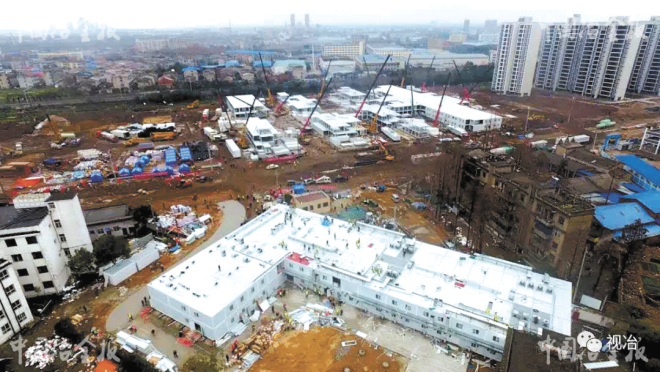 在疫情防控阻擊戰中,中國一冶在做好內部防控的同時,還積極參與武漢雷神山、火神山、鄂州雷山等醫院建設。圖為2020年2月4日,中國一冶承建的鄂州雷山醫院項目。 (陳明 攝)
