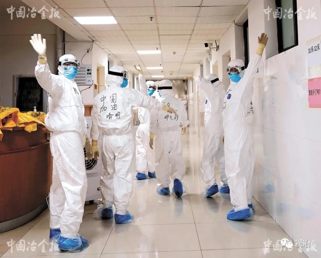 2020年3月6日,新鋼中心醫院醫護人員圓滿完成了江西省新余市新冠肺炎患者的救治任務,醫務人員在對病區消毒、整理后,正式撤離至新余市袁河賓館開始集中隔離。圖為部分醫護人員向隔離病區揮手告別。 (歐陽斯娟 攝)