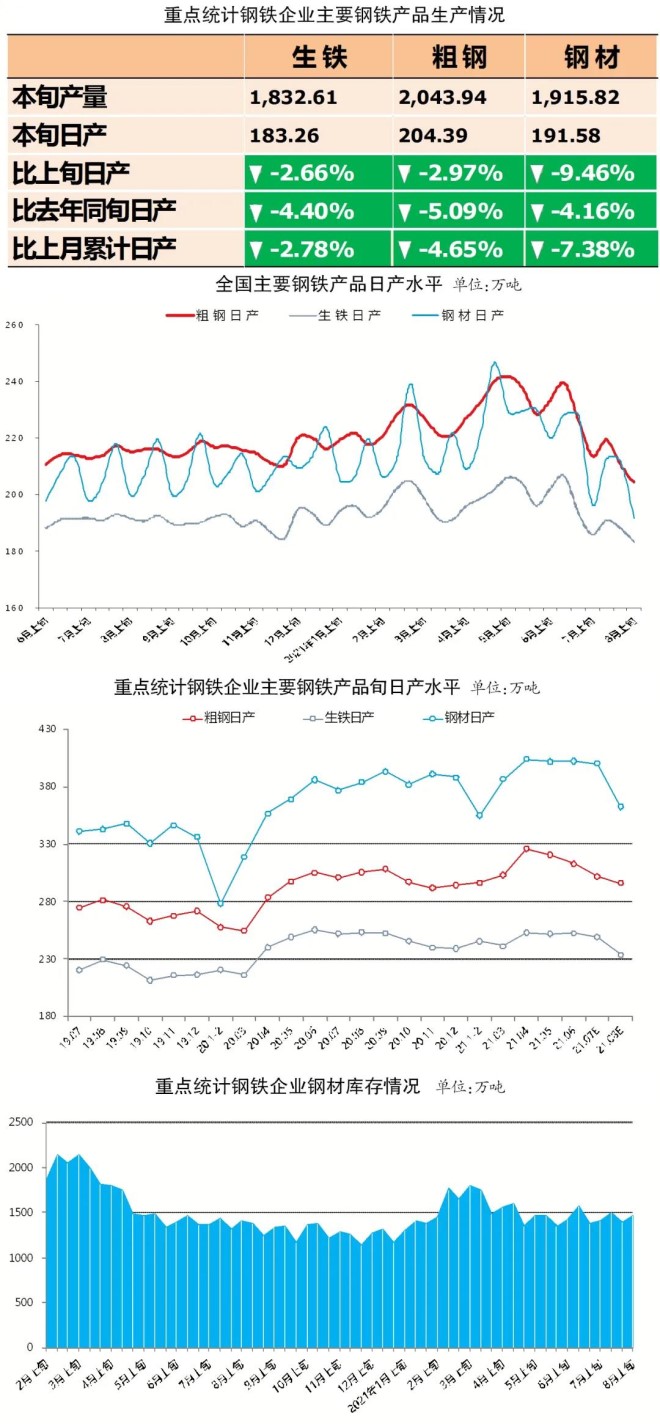 8月上旬,重點統計鋼鐵企業共生產粗鋼2043.94萬噸、生鐵1832.61萬噸、鋼材1915.82萬噸。其中,粗鋼日產204.39萬噸,環比下降2.97%、同比下降4.40%;生鐵日產183.26萬噸,環比下降2.66%、同比下降5.09%;鋼材日產191.58萬噸,環比下降9.46%、同比下降4.16%(受鞍鋼集團ERP取數原則和部分企業月底集中入庫等因素影響,本旬鋼材產量相比上一旬減幅偏大。剔除這些因素,本旬鋼材產量比上一旬下降5.49%)。這是旬度粗鋼日產量繼7月下旬首次實現同比下降之后繼續同比下降,說明壓減產量政策效應在逐漸呈現。