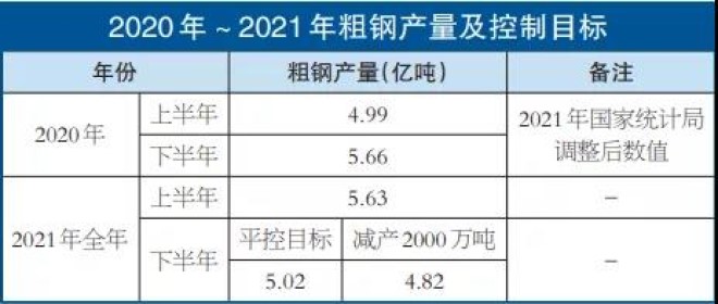 今年初,工信部已經明確要確保今年粗鋼產量同比下降。國家統計局數據顯示,2020年我國粗鋼產量為10.65億噸。今年上半年,全國累計生產粗鋼5.63億噸,同比增長5912.1萬噸,增幅達11.80%。如果按照2021年全年粗鋼產量與2020年持平計算,那么2021年下半年粗鋼產量要保持在5.02億噸左右。而2020年下半年粗鋼產量為5.66億噸。與2020年下半年相比,要想實現控產量目標,則今年下半年粗鋼產量至少要同比下降6400萬噸以上。若要在2020年基礎上壓減粗鋼產量2000萬噸,則今年下半年粗鋼產量至少要同比下降8400萬噸以上。