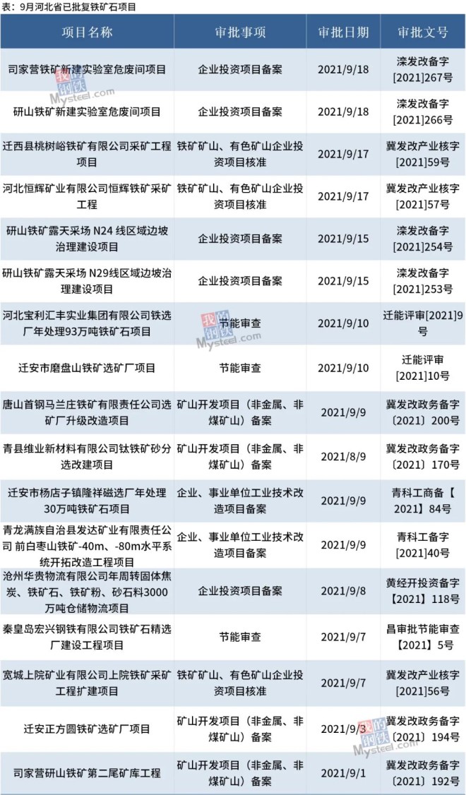 據(jù)不完全統(tǒng)計,2021年9月河北省共批復(fù)鐵礦石相關(guān)項目17個,其中,有4個礦山開發(fā)項目(非金屬、非煤礦山)備案,2個企業(yè)、事業(yè)單位工業(yè)技術(shù)改造項目備案、3個節(jié)能審查、3個鐵礦礦山、有色礦山企業(yè)投資項目核準(zhǔn)和5個企業(yè)投資項目備案,具體情況如下: