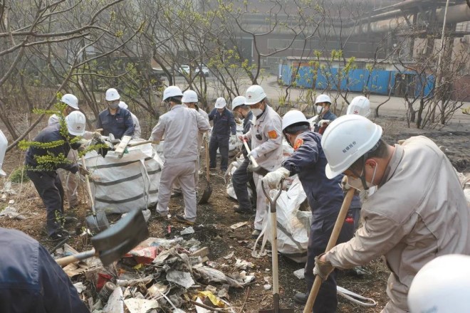 圖為2021年4月份,鞍鋼股份煉鋼總廠機(jī)關(guān)干部參加勞動,整治環(huán)境,建設(shè)美麗鋼廠。(鞍鋼供圖)