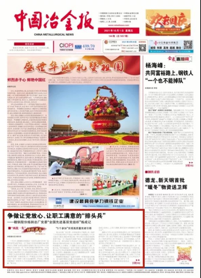 7月2日,鞍鋼股份煉鋼總廠黨委書記楊文代表廠黨委參加完全國“兩優(yōu)一先”表彰大會和慶祝建黨100周年活動后,帶著“全國先進(jìn)基層黨組織”的大紅證書馬不停蹄地從北京趕回廠里。“回來后要重點做兩件事:一件是向全廠黨員干部職工傳達(dá)好習(xí)近平總書記在慶祝中國共產(chǎn)黨成立100周年大會上的重要講話精神,引導(dǎo)廣大黨員干部職工弘揚光榮傳統(tǒng)、賡續(xù)紅色血脈,讓偉大建黨精神在我們鋼廠生根結(jié)果;另一件就是立足本職工作,帶領(lǐng)全廠黨員干部職工想方設(shè)法提指標(biāo)、多創(chuàng)效,不斷提高煉鋼總廠的競爭力,為高質(zhì)量發(fā)展新鞍鋼建設(shè)做出貢獻(xiàn)。”楊文說。