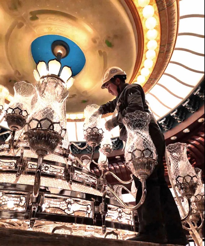 圖為張宣高科機(jī)電公司維保人員正在對“一帶一路”國際合作峰會(huì)主會(huì)場吊燈進(jìn)行維護(hù)。