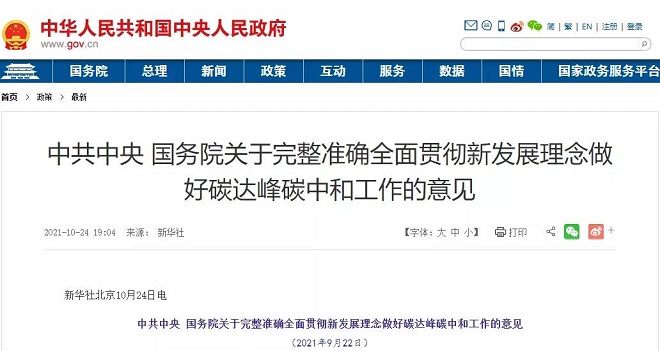 10月24日,中國政府網發布了《中共中央 國務院關于完整準確全面貫徹新發展理念做好碳達峰碳中和工作的意見》(以下簡稱《意見》,這是中央層面對碳達峰、碳中和工作的系統謀劃、總體部署。