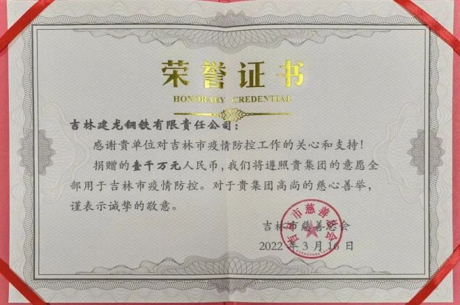建龍集團董事長、總裁張志祥高度關注吉林疫情情況,要求地處吉林的兩家子公司——吉林建龍、吉林恒聯,在嚴格落實地方政府關于此次疫情防控工作的具體要求的同時,積極履行社會責任,合計向屬地政府捐款1500萬元,助力吉林打贏此輪新冠肺炎疫情阻擊戰。