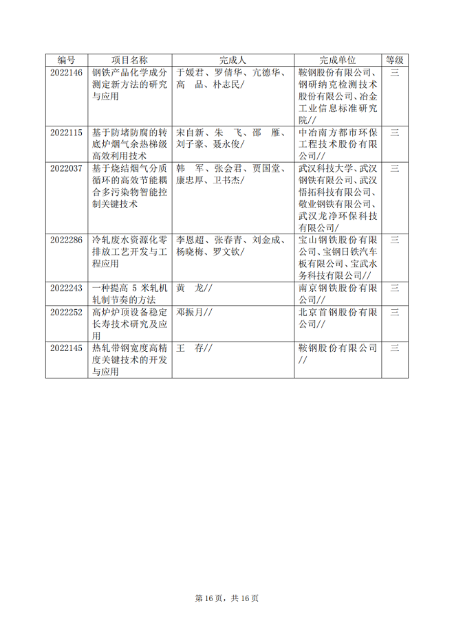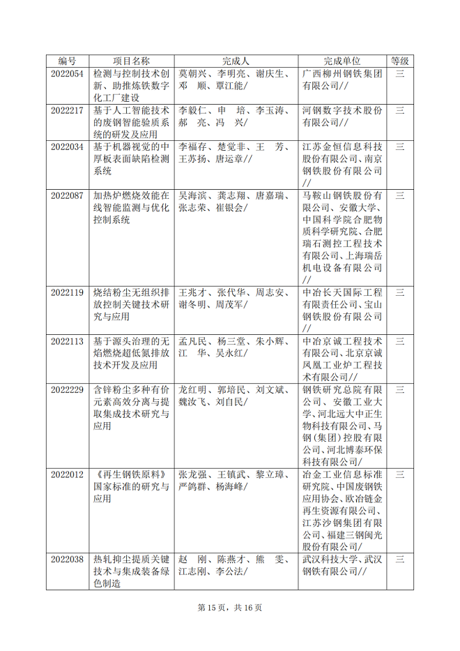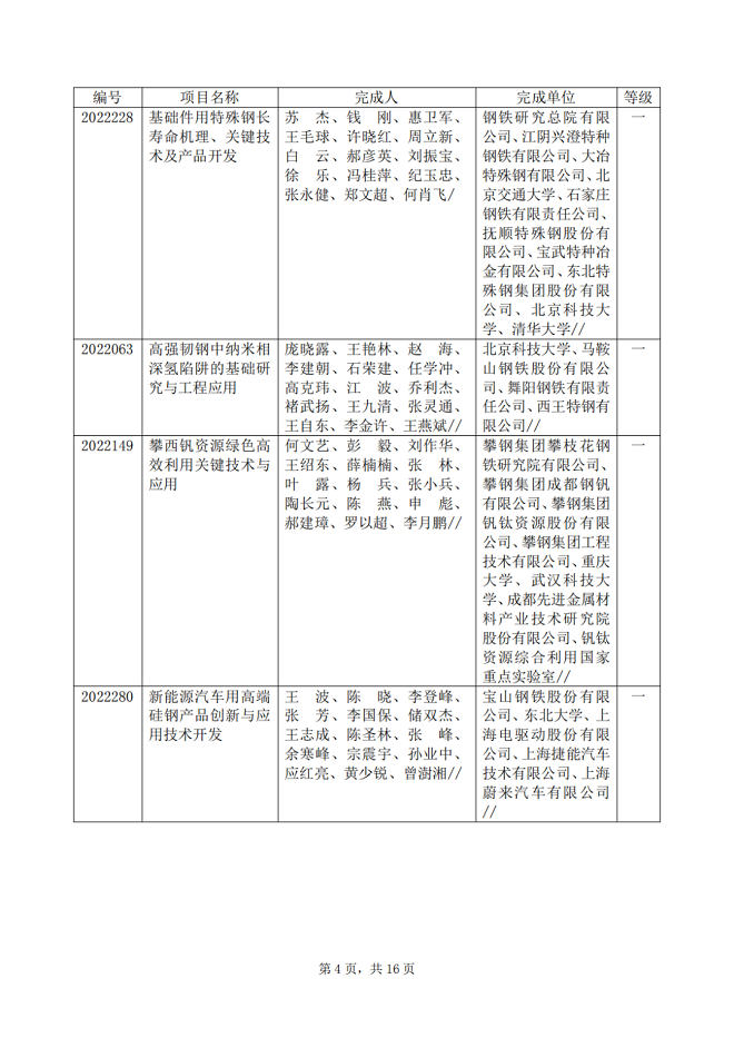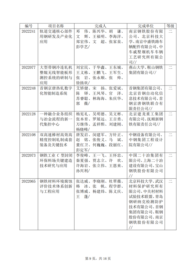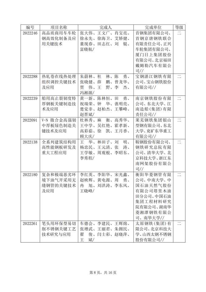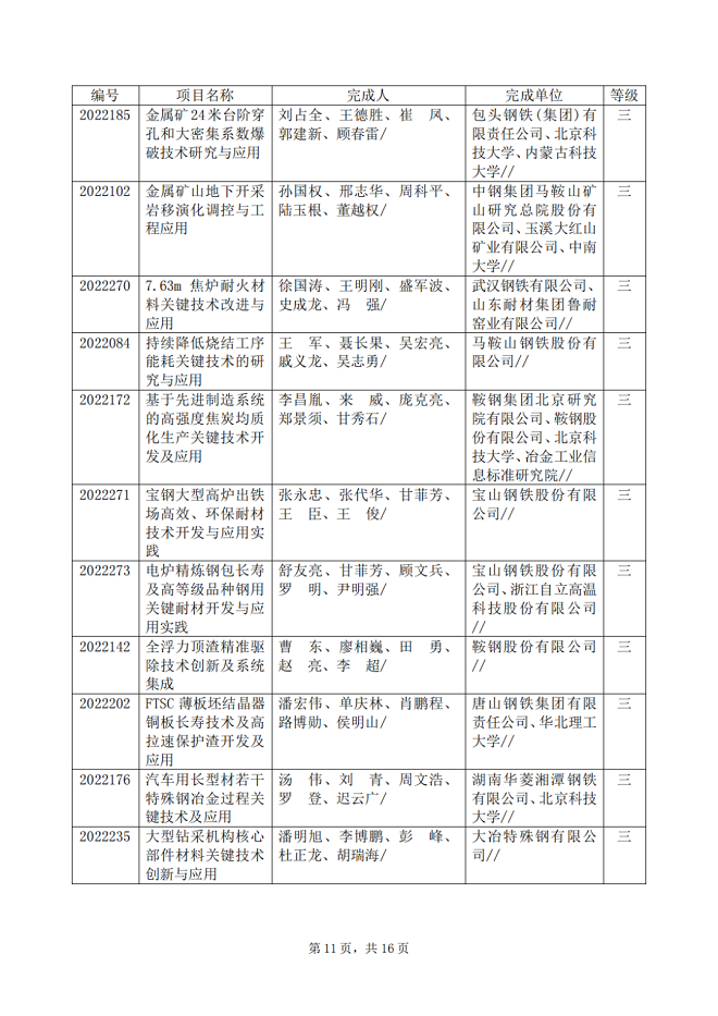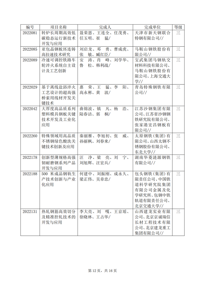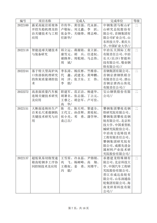 2022年中國鋼鐵工業協會、中國金屬學會冶金科學技術獎(簡稱冶金科學技術獎)專業評審工作已經結束,共推薦獲獎項目114項,其中:特等獎1項,一等獎28項,二等獎26項,三等獎59項。根據評審程序,現將專業評審推薦獲獎項目的名稱、完成單位、完成人、推薦等級等向社會公告。