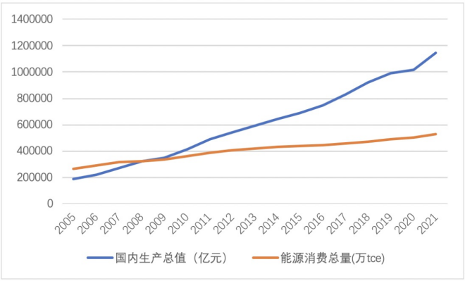 圖1 2005-2020年我國(guó)能源消耗總量與國(guó)內(nèi)生產(chǎn)總值變化趨勢(shì)(數(shù)據(jù)來源:國(guó)家統(tǒng)計(jì)局)