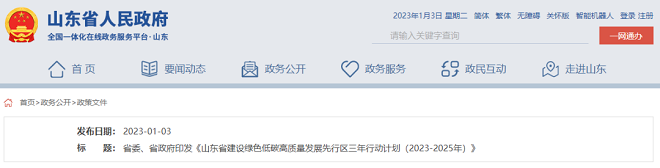 1月3日,山東省委、省政府印發《山東省建設綠色低碳高質量發展先行區三年行動計劃(2023—2025年)》,并發出通知,要求各級各部門各單位結合實際認真貫徹落實。