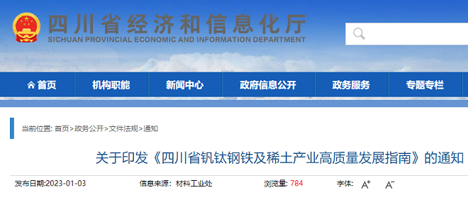 1月3日,四川省經濟和信息化廳印發《四川省釩鈦鋼鐵及稀土產業高質量發展指南》(以下簡稱《指南》),明確到2025年,培育2~3個超百億產值的釩和鈦產業集群;建成全國最大的海外稀土資源加工基地;培育形成一批有國際競爭力的釩鈦鋼鐵及稀土大企業大集團,推動釩鈦鋼鐵及稀土產業規模達到6000億元以上。