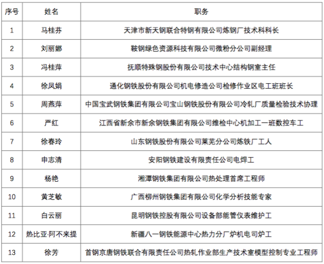 據不完全統計,鋼鐵行業11個集團榮獲全國五一巾幗標兵崗,13位職工榮獲全國五一巾幗標兵,具體名單如下: