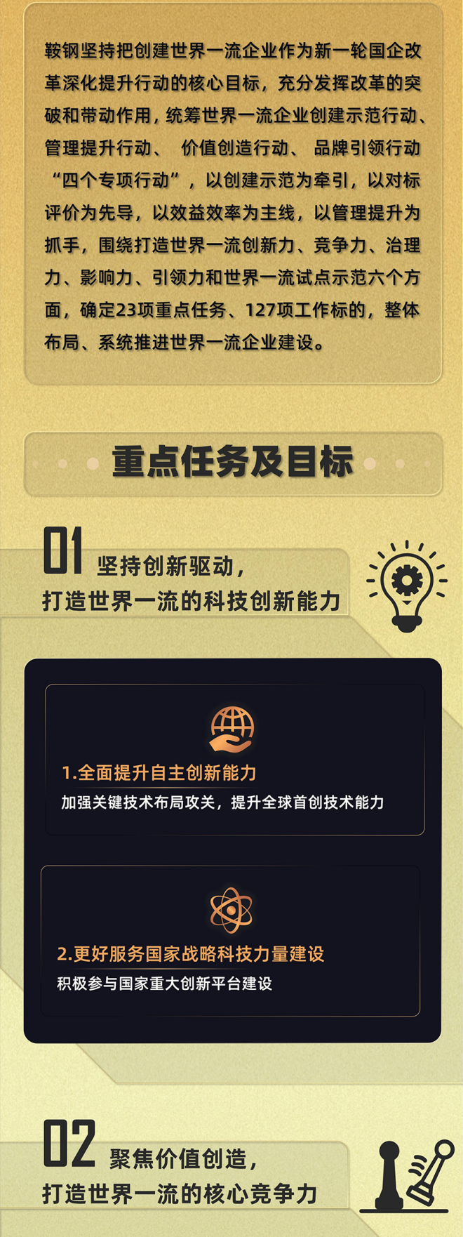《安排》指出,鞍鋼集團堅持把創建世界一流企業作為新一輪國企改革深化提升行動的核心目標,充分發揮改革的突破和帶動作用,統籌世界一流企業創建示范行動、管理提升行動、價值創造行動、品牌引領行動“四個專項行動”,以創建示范為牽引、以對標評價為先導、以效益效率為主線、以管理提升為抓手,圍繞打造世界一流創新力、競爭力、治理力、影響力、引領力和世界一流試點示范6個方面確定23項重點任務。