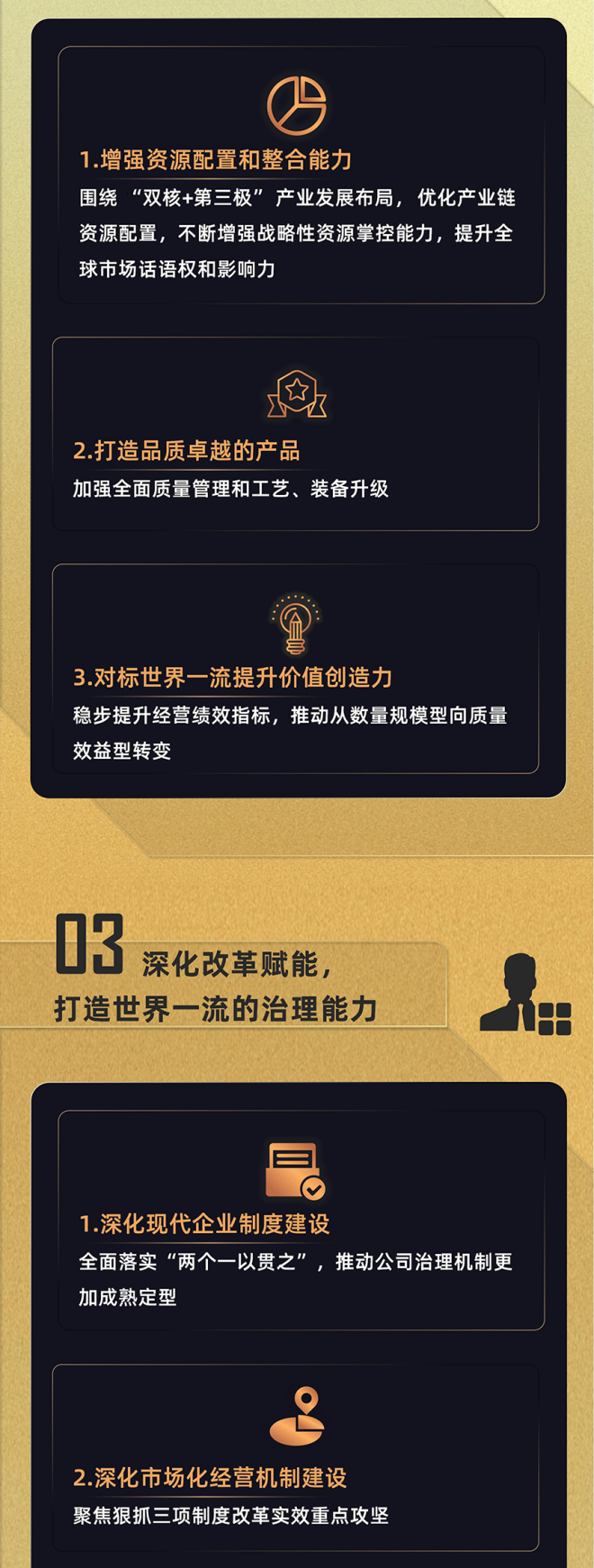 ——聚焦價值創造,打造世界一流的核心競爭力。增強資源配置和整合能力,圍繞“雙核+第三極”產業發展布局,優化產業鏈資源配置,不斷增強戰略性資源掌控能力,提升全球市場話語權和影響力;打造品質卓越的產品,加強全面質量管理和推進工藝、裝備升級;對標世界一流提升價值創造力,穩步提升經營績效指標,推動從數量規模型向質量效益型轉變。