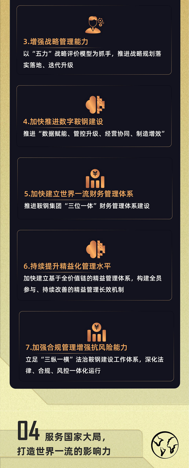 ——深化改革賦能,打造世界一流的治理能力。深化現代企業制度建設,全面落實“兩個一以貫之”,推動公司治理機制更加成熟定型;深化市場化經營機制建設,聚焦狠抓三項制度改革實效重點攻堅;增強戰略管理能力,以“五力”戰略評價模型為抓手,推進戰略規劃落實落地、迭代升級;加快推進數字鞍鋼建設,推進“數據賦能、管控升級、經營協同、制造增效”;加快建立世界一流財務管理體系,推進鞍鋼集團“三位一體”財務管理體系建設;加快建立基于全價值鏈的精益管理體系,構建全員參與、持續改善的精益管理長效機制;加強合規管理,增強抗風險能力,立足“三縱一橫”法治鞍鋼建設工作體系,深化法律、合規、風控一體化運行。