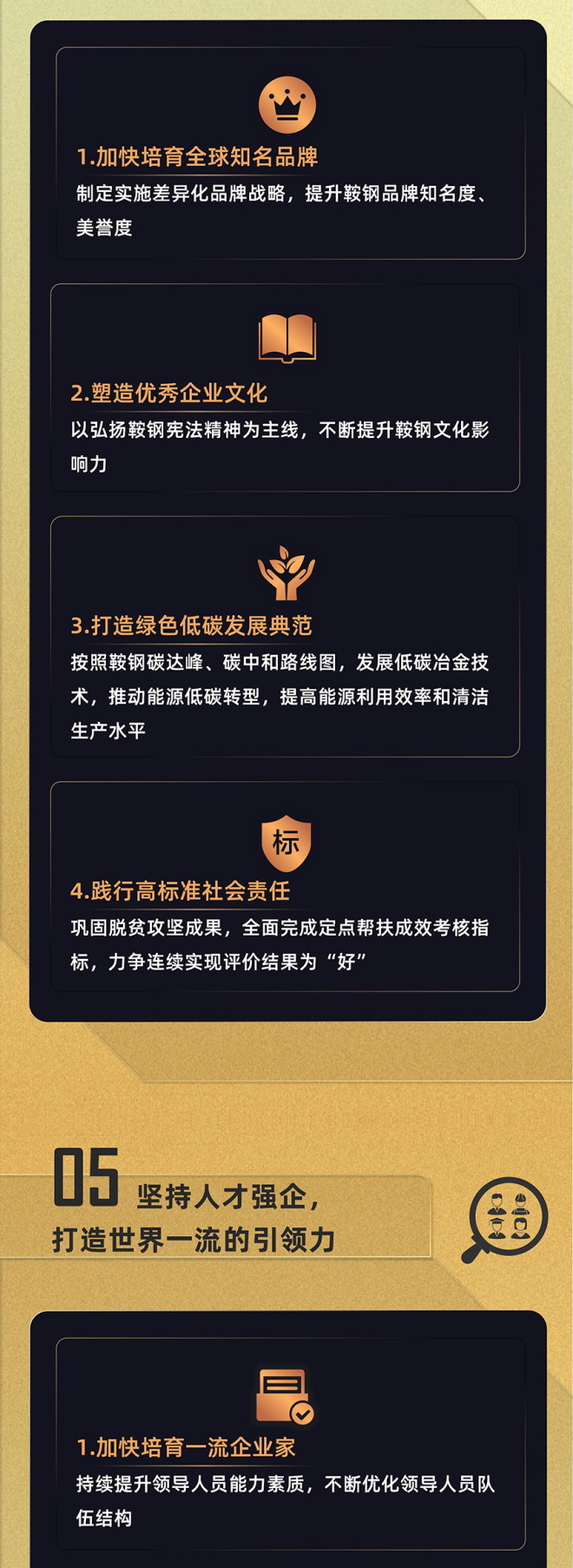 ——服務國家大局,打造世界一流的影響力。加快培育全球知名品牌,制定實施差異化品牌戰略,提升鞍鋼品牌知名度、美譽度;塑造優秀企業文化,以弘揚“鞍鋼憲法”精神為主線,不斷提升鞍鋼文化影響力;打造綠色低碳發展典范,按照鞍鋼集團碳達峰、碳中和路線圖,發展低碳冶金技術,推動能源低碳轉型,提高能源利用效率和清潔生產水平;踐行高標準社會責任,鞏固脫貧攻堅成果,全面完成定點幫扶成效考核指標,力爭連續實現評價結果為“好”。