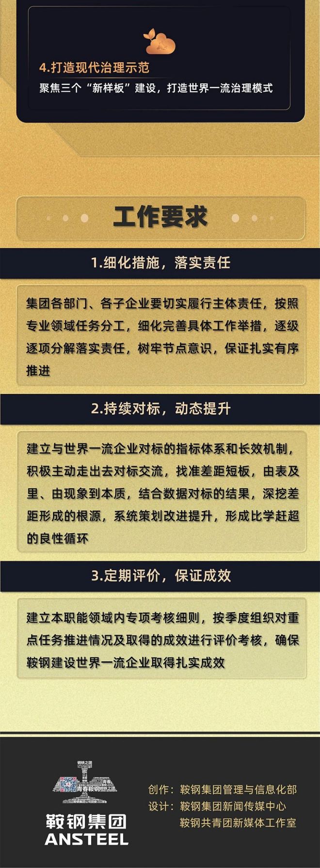 《安排》要求,鞍鋼集團各部門、各子企業要切實履行主體責任,按照專業領域任務分工,細化完善具體工作舉措,逐級逐項分解落實責任,樹牢節點意識,保證扎實有序推進;建立與世界一流企業對標的指標體系和長效機制,積極主動走出去對標交流,找準差距短板,由表及里、由現象到本質,結合數據對標結果,深挖差距形成根源,系統策劃改進提升,形成“比學趕超”的良性循環;建立本職能領域內專項考核細則,按季度組織對重點任務推進情況及取得的成效進行評價考核,確保鞍鋼集團建設世界一流企業取得扎實成效。
