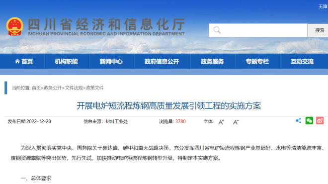 2022年12月28日,四川省經濟和信息化廳網站發(fā)布了《開展電爐短流程煉鋼高質量發(fā)展引領工程的實施方案》(以下簡稱《方案》)。